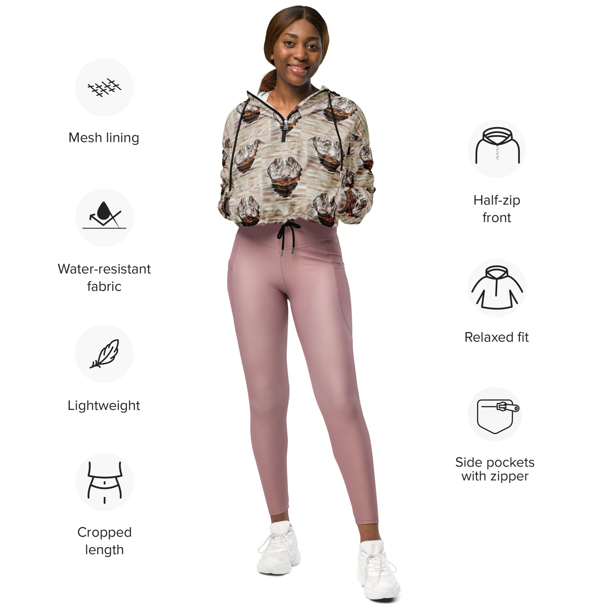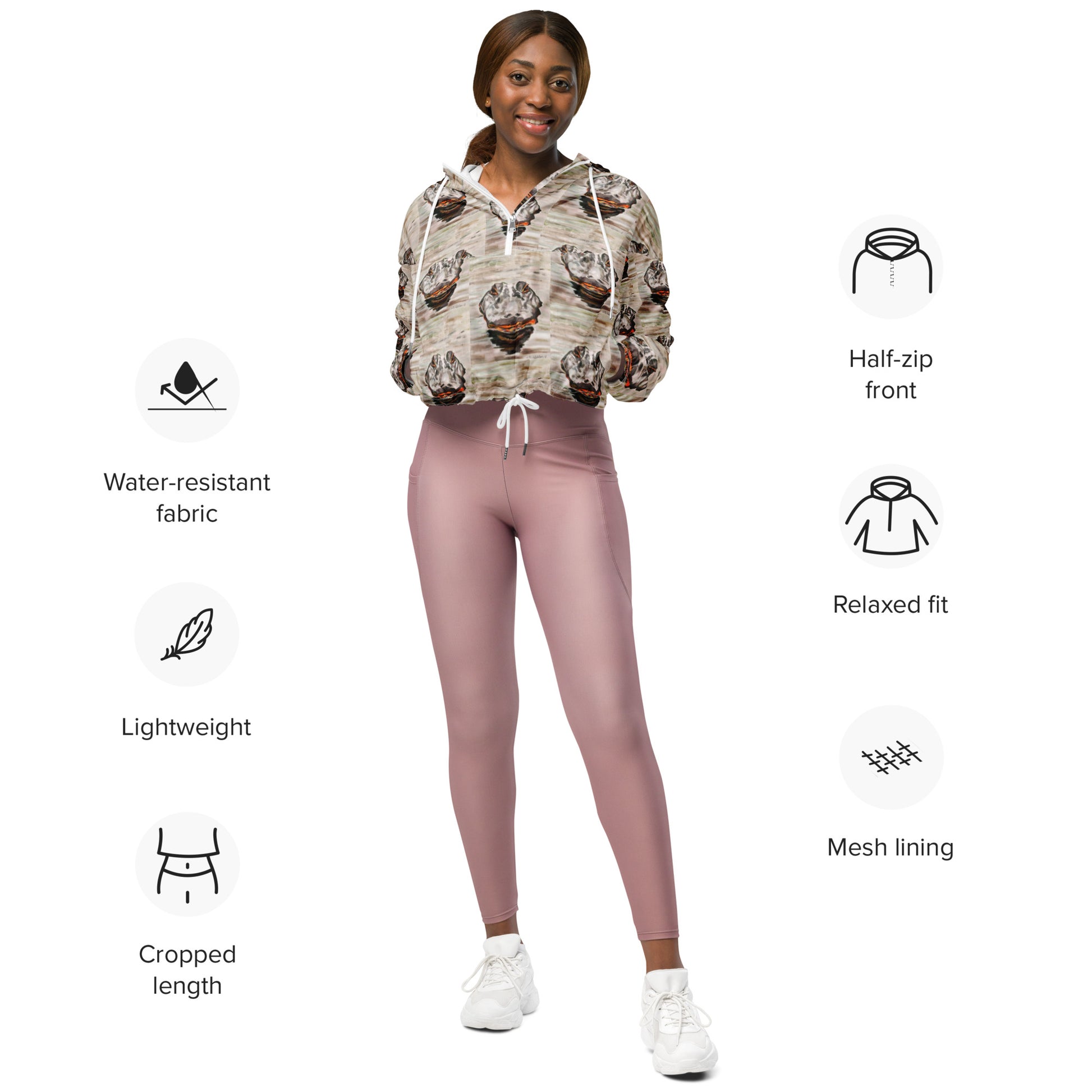 Hike in style without the rain getting in the way—this cropped windbreaker is lightweight, waterproof, and suitable for every kind of adventure. Features include side-slit pockets, breathable mesh lining, and adjustable drawcords on the hood and waist to support all your stylish outdoor looks.