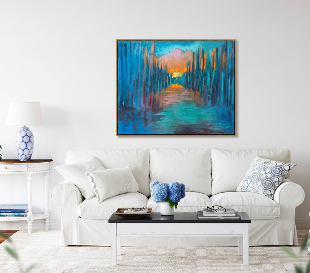 This sunset is moody and alluring. Smokey blues contrast with the vibrant colors of a sunset and bring a peaceful and calming experience for your space. The tall, majestic trees reflect on the rippling waters with dark shadows. This piece brings in unexpected pops of color into any space. I choose a gold floating frame to add warmth and a sophisticated finish.