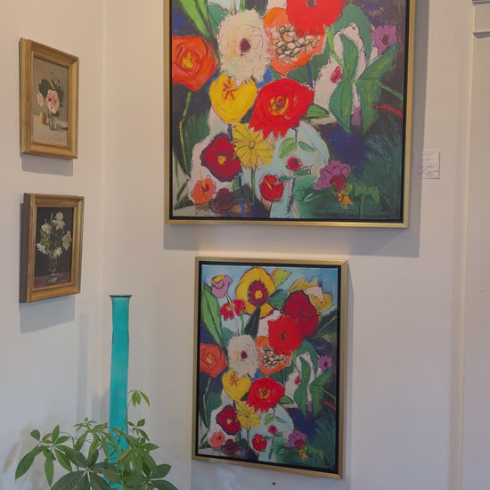 Zinnias (33x48”) Giclee printed canvas with gold floating frame