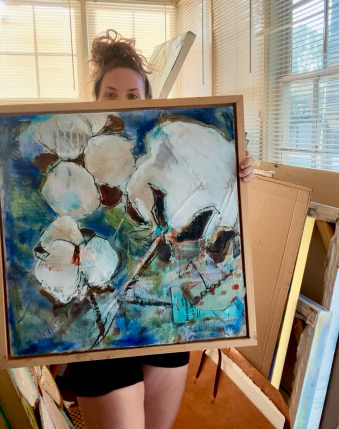 (24x24”) vintage ephemera collage with oil on wood. Natural wood floating frame